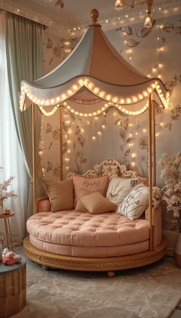 Transform a quiet corner into a carousel-inspired escape. Use a round canopy, soft pastel cushions, and gentle lighting to mimic the dreamy feel of a merry-go-round.