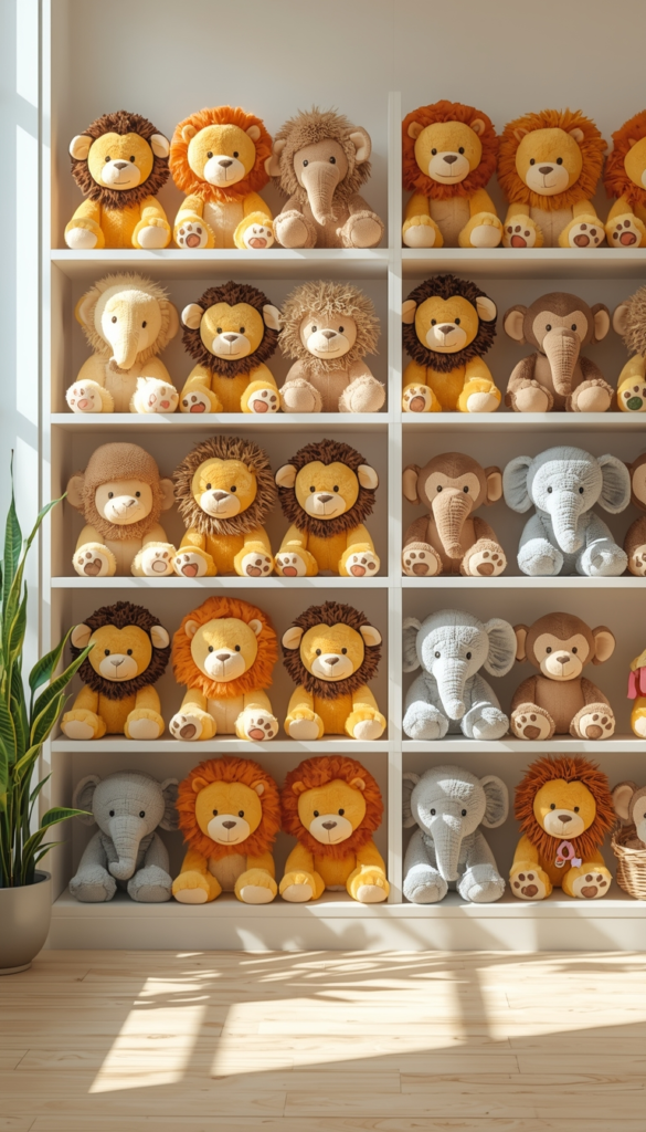 Decorating with circus animal plush toys adds charm and softness. Arrange them neatly on shelves or in baskets to keep the room organized yet playful.