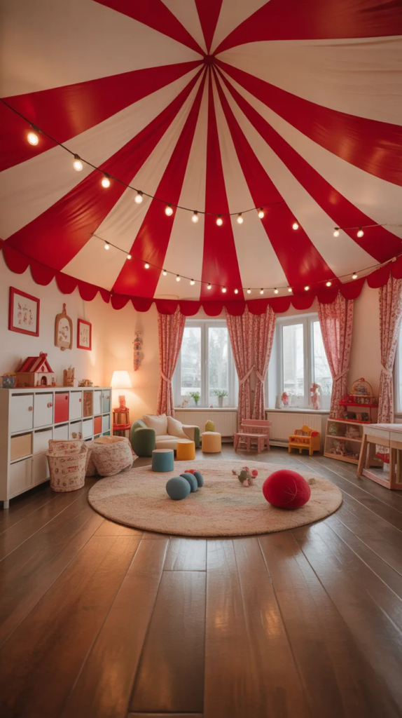 Creating a striped ceiling instantly transforms any room into a circus tent. Red and white fabric panels or painted stripes draw the eye upward, making the space feel playful and immersive. This trend is popular because it creates a strong visual theme without overwhelming the room’s layout.