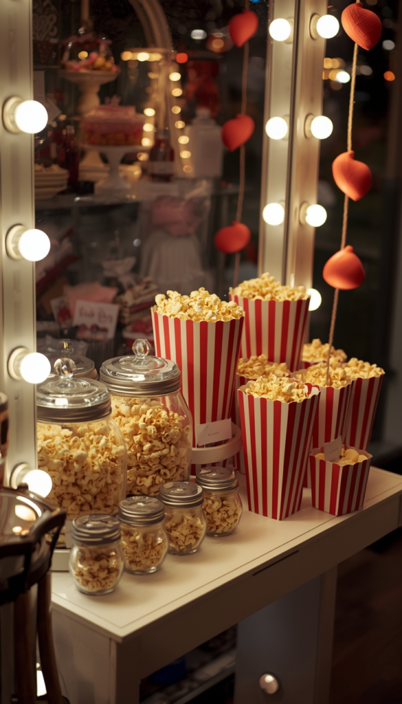 A mini popcorn station brings both decor and functionality. Use clear jars, striped boxes, and a small cart for that carnival feel.