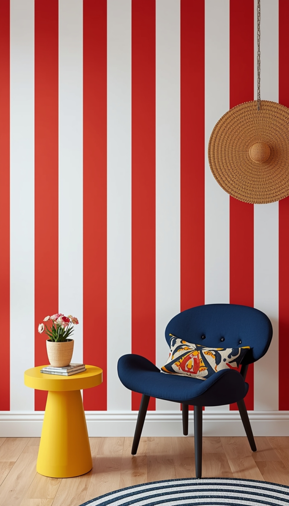 An accent wall with circus stripes creates a strong focal point. Vertical lines make the room feel taller and more dynamic.