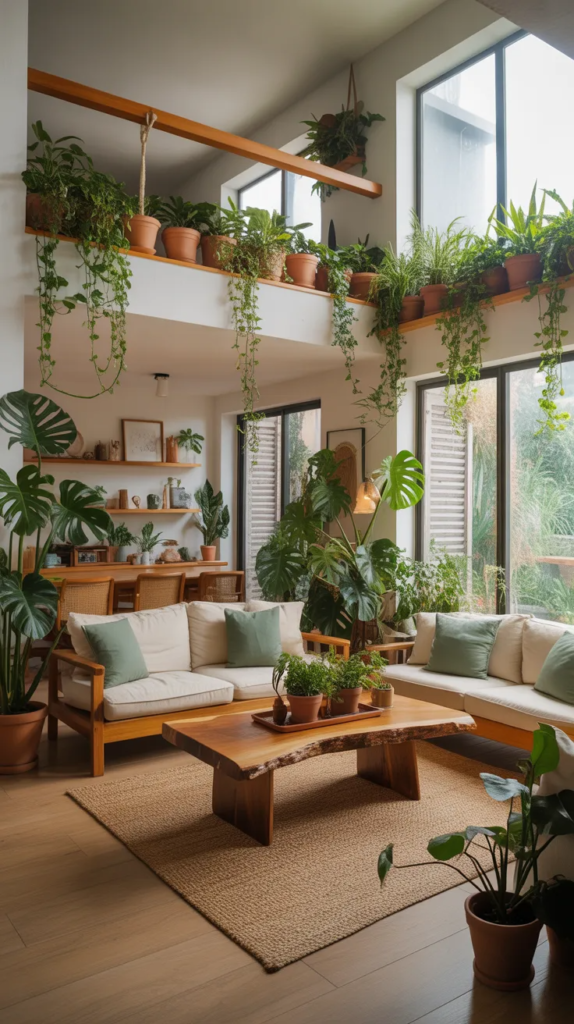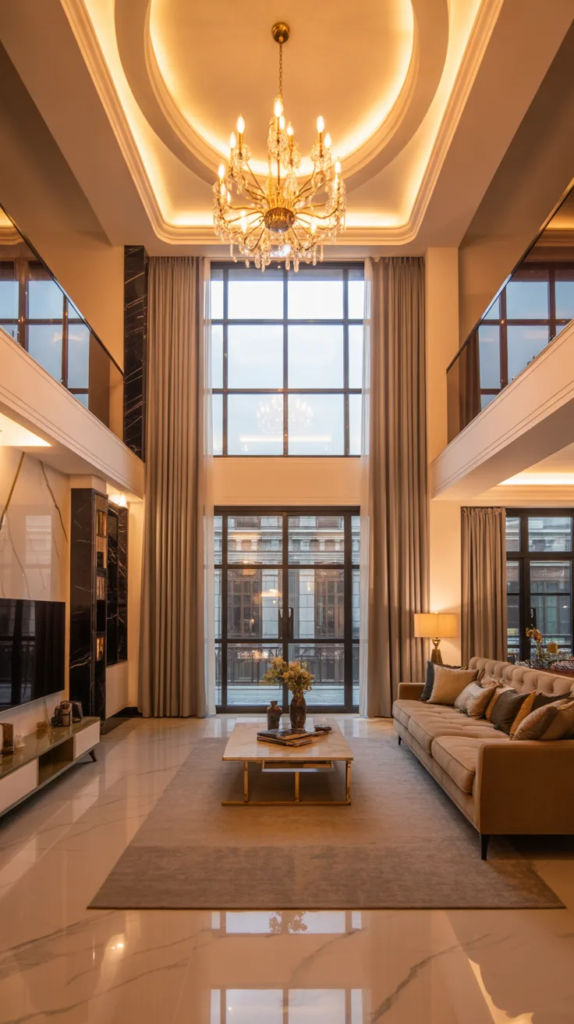 This idea is trending because it adds visual impact without overcrowding the space. Pair it with statement lighting, textured walls, and elegant furniture to elevate the look. The vertical space allows creativity, from hanging lights to art displays. It’s the kind of space that makes you pause, breathe, and truly feel at home.