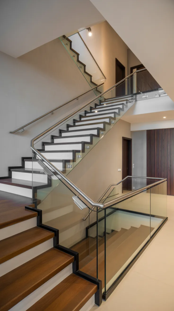 A floating staircase is one of the most eye-catching Duplex House Design Ideas, perfect for adding a sleek and modern touch. The steps appear to “float” without visible support, creating a light and open visual effect that makes the entire space feel more spacious and refined.