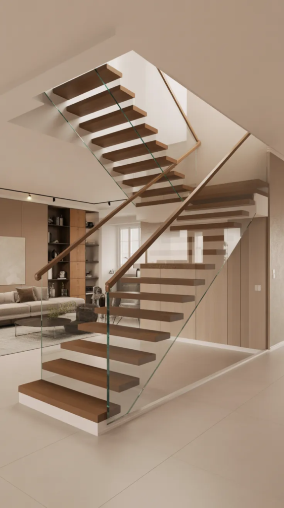 This design is trending because it blends architecture with art. Pair it with glass railings and warm wood tones to balance elegance with comfort. The clean structure enhances modern interiors while keeping things visually uncluttered. Every time you walk past it, it feels like a piece of design magic in your home.