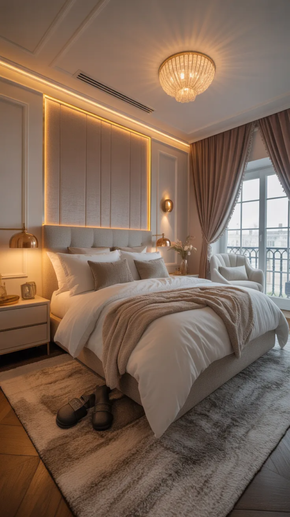 A luxurious bedroom retreat turns your duplex into a sanctuary. Soft bedding, layered fabrics, and warm lighting create a space that feels relaxing and indulgent at the same time.