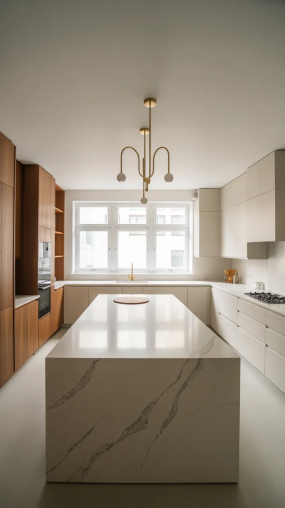 This design is trending because it makes kitchens more interactive and efficient. Marble countertops, wooden cabinets, and soft lighting create a warm yet modern feel. It’s a space where cooking, conversations, and memories come together beautifully.