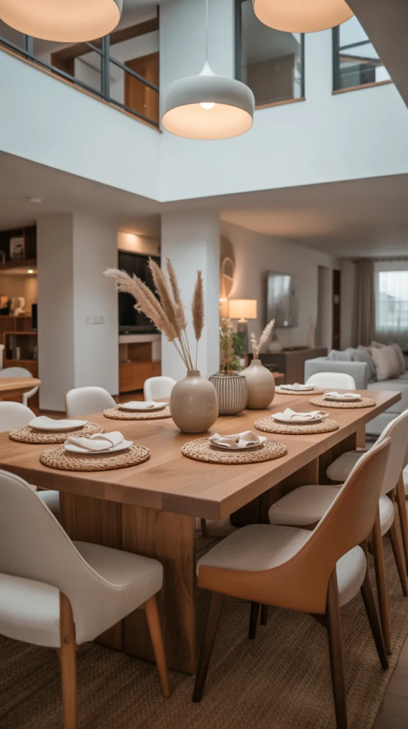 An open dining area connected to the living space creates a warm and social atmosphere. It makes gatherings feel more natural and connected.