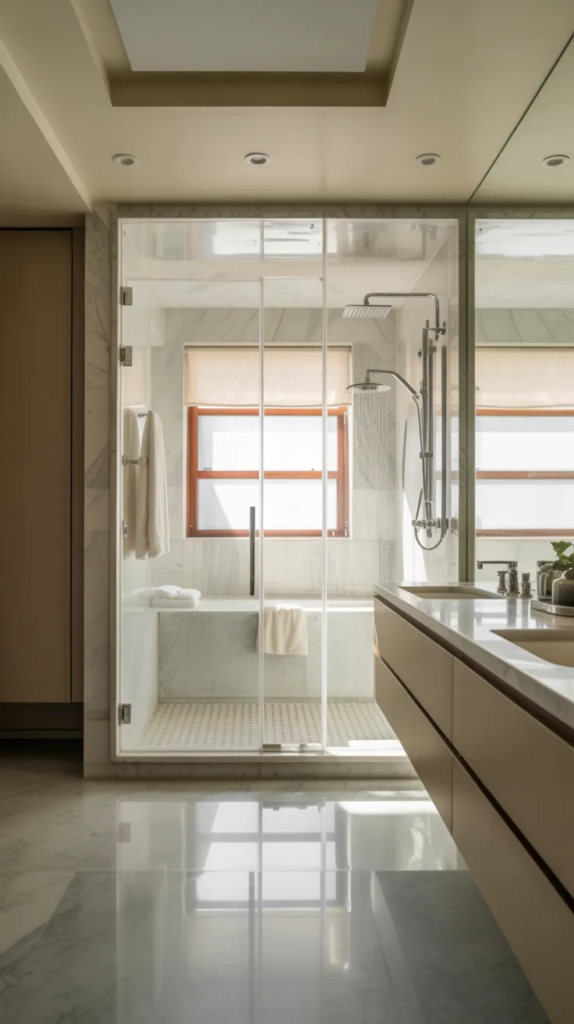 This trend focuses on comfort and simplicity. Marble, glass, and warm lighting add a touch of luxury without being overwhelming. It’s a space where you can unwind and recharge in peace.