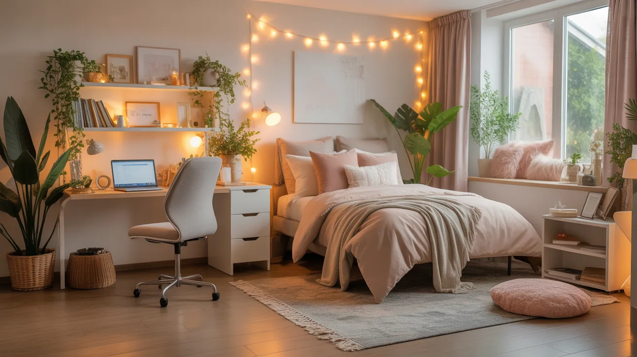 Soft lighting combined with delicate fabrics creates a romantic and calming dorm environment. Sheer curtains, warm lamps, and pastel tones make the space feel peaceful and emotionally comforting.