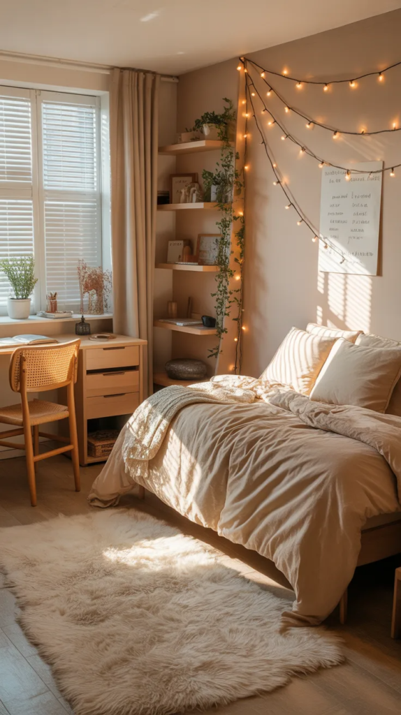Neutral tones like beige, ivory, and soft whites create a peaceful environment that instantly relaxes your mind after a long, busy day. When paired with a light wooden desk and soft linen bedding, the room starts to feel more open, airy, and breathable, even if your dorm space is small. Natural sunlight reflecting off these soft shades makes everything feel brighter and more inviting, helping you stay mentally refreshed.