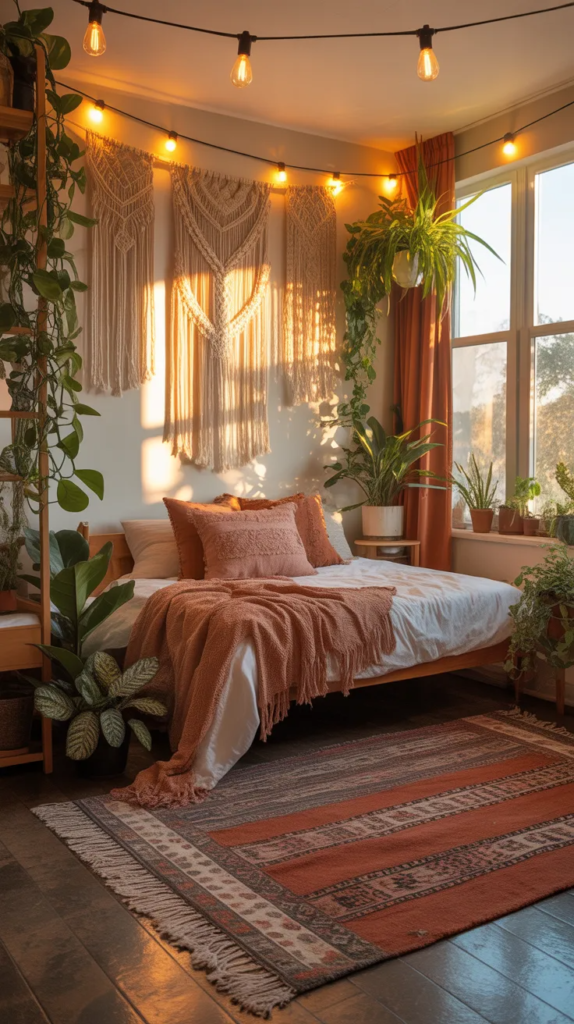 A boho-style dorm room brings together layers of texture, warm earthy tones, and relaxed decor elements that make your space feel deeply personal and lived-in. Think woven wall hangings, layered rugs, soft floor cushions, and colors like rust, terracotta, mustard, and olive green blending together beautifully. This setup creates a sense of warmth that makes your room feel less like a dorm and more like a cozy retreat.