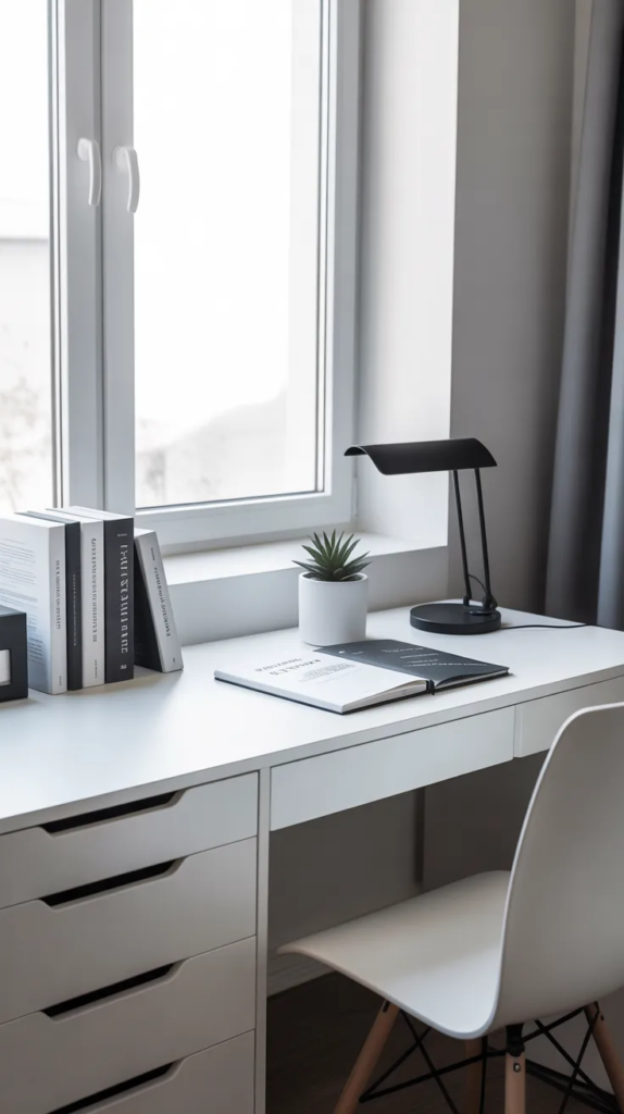 This setup is trending because it reduces visual noise and helps improve focus naturally without feeling boring or empty. By adding textured pillows, a chunky knit throw, and a warm desk lamp, you can bring depth and comfort into the space without overwhelming it. The overall feeling is soft, balanced, and emotionally calming. It feels like stepping into peace every time you enter.