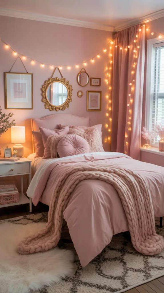 Blush pink tones bring a gentle warmth into your dorm room that instantly makes the space feel soft, cozy, and emotionally comforting. When paired with gold accents, warm lighting, and plush textures like velvet cushions or fluffy rugs, the entire setup starts to feel elegant without being overwhelming. It creates a dreamy environment where both studying and relaxing feel enjoyable.