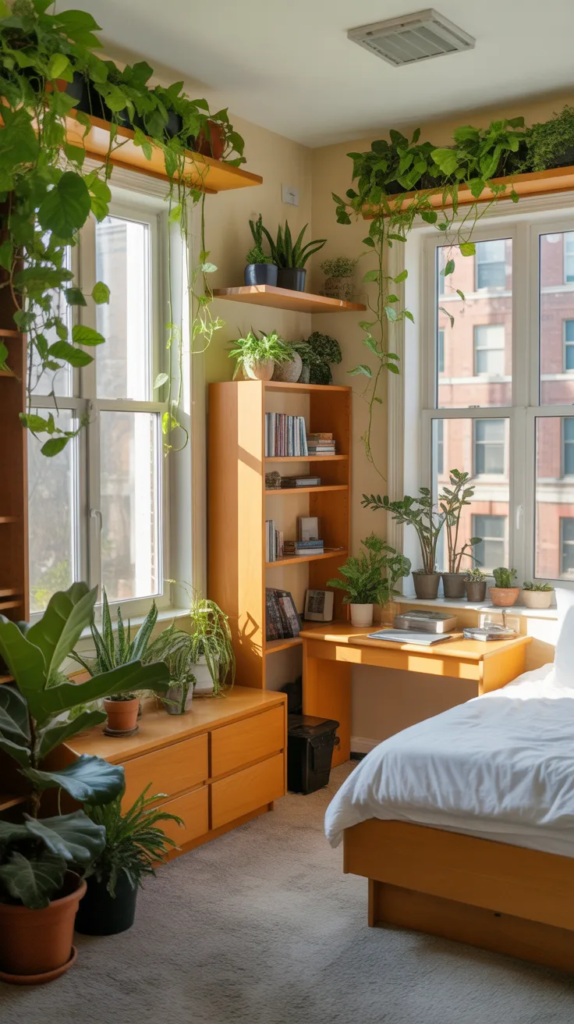 Bringing nature into your dorm room instantly changes the energy of the space. Green plants, even small ones, create a fresh and lively atmosphere that makes your room feel more open and breathable. When combined with wooden furniture, neutral fabrics, and natural light, the entire setup feels grounded and connected to the outdoors.