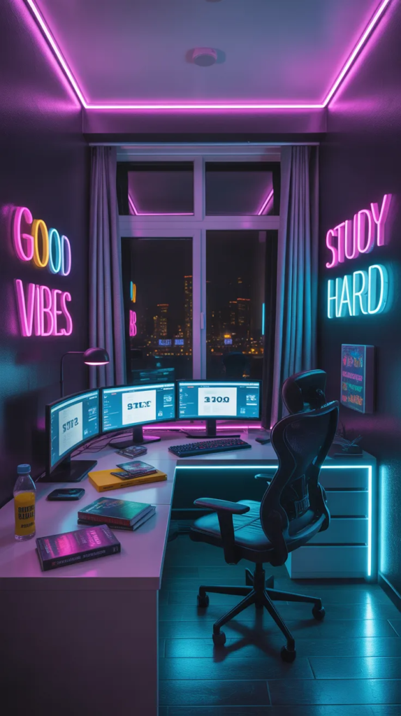 LED lighting has completely transformed how dorm rooms look and feel, especially for students who love a modern and slightly dramatic aesthetic. With color-changing LED strips and neon accents, you can completely shift the mood of your room depending on your energy—cool blues for focus, warm tones for relaxation, or vibrant colors for fun evenings.