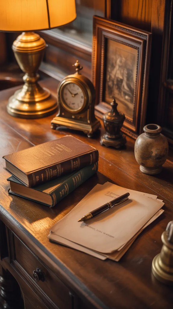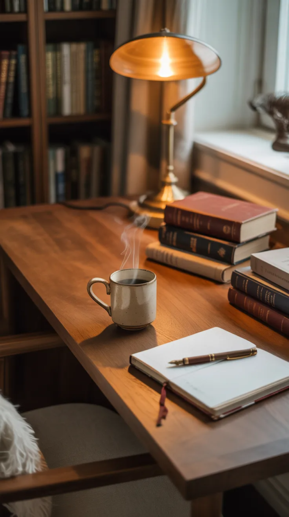 The vintage academic aesthetic is inspired by old libraries, classic literature, and timeless study environments that feel rich and intellectual. Dark wood furniture, warm desk lamps, stacked books, and muted tones like deep brown, burgundy, and forest green create a deeply focused and slightly dramatic atmosphere.