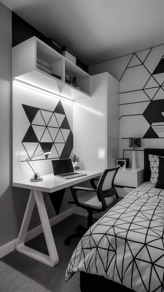 A monochrome dorm setup uses black and white tones to create a bold, clean, and visually striking space without needing too many colors. The contrast between light and dark elements adds depth while still keeping the design simple and organized. Geometric patterns and sleek furniture enhance the modern feel even more.