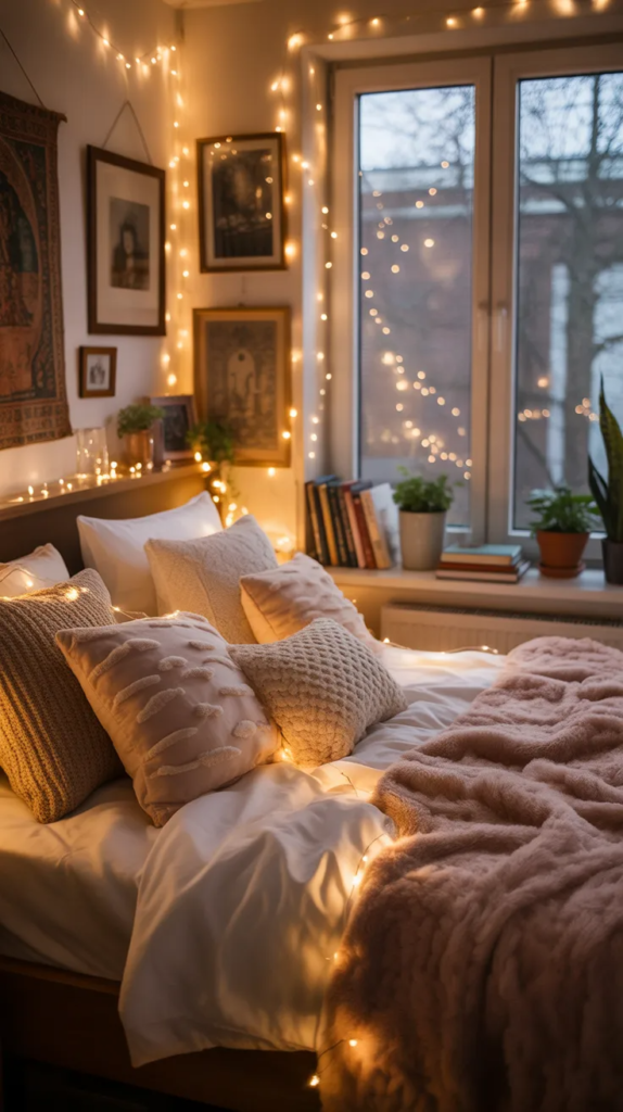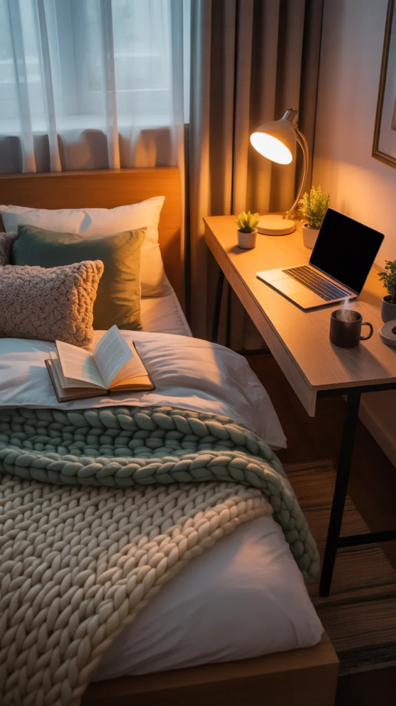 Layering different textures is one of the easiest ways to make your dorm feel instantly cozy and inviting. Combining materials like knit blankets, faux fur cushions, cotton bedding, and soft rugs adds depth and visual interest while also making the space feel physically comfortable.