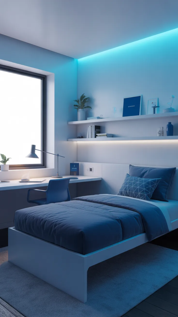 This idea is trending because students are focusing more on mental clarity and concentration. Pairing blue tones with white or light furniture keeps the space fresh and clean. The room feels cool, stable, and refreshing. Like a calm, clear sky on a quiet day.