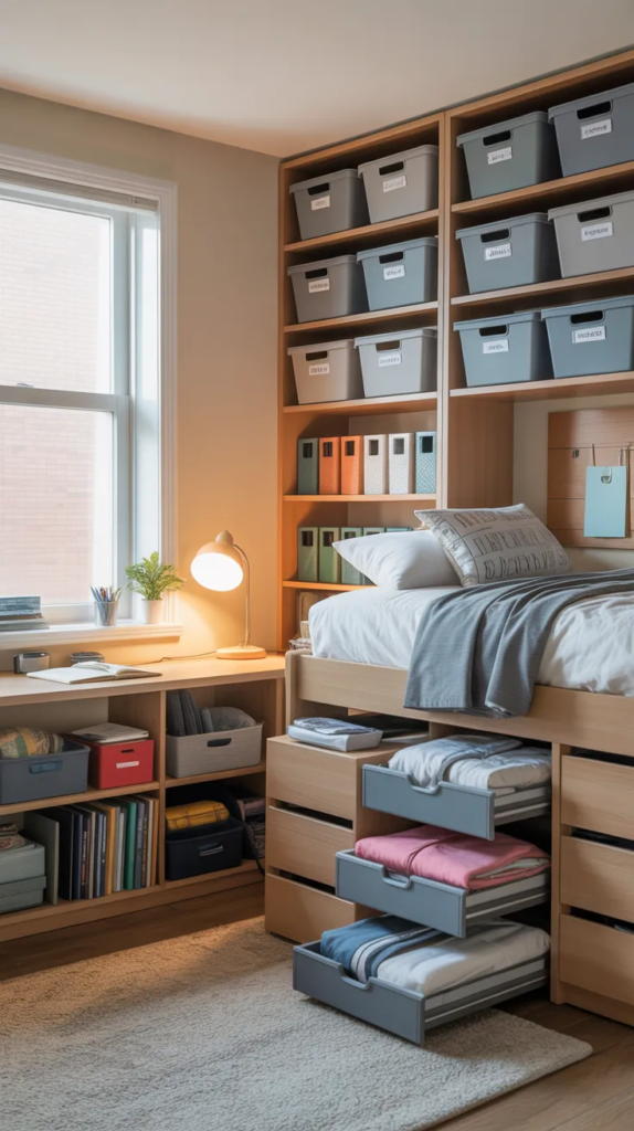 Dorm rooms are usually small, which makes smart storage solutions essential for keeping your space clean and stress-free. Using shelves, storage bins, and under-bed organizers allows you to maximize every inch while maintaining a tidy and organized look.