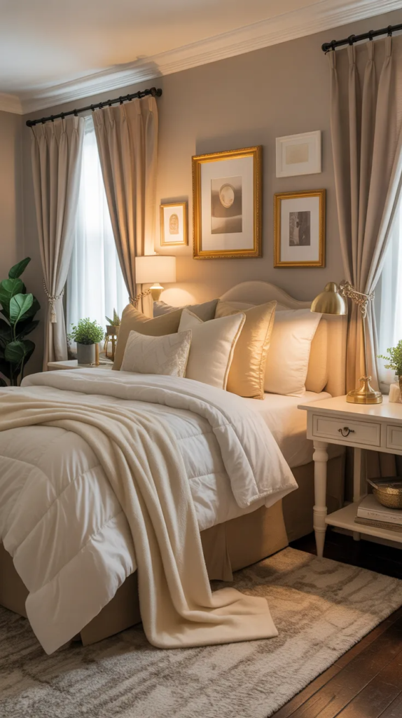 Neutral colors paired with luxurious textures can make even a simple dorm room feel high-end and polished. Shades like cream, beige, and soft taupe combined with gold accents and plush fabrics create an elegant and refined environment.