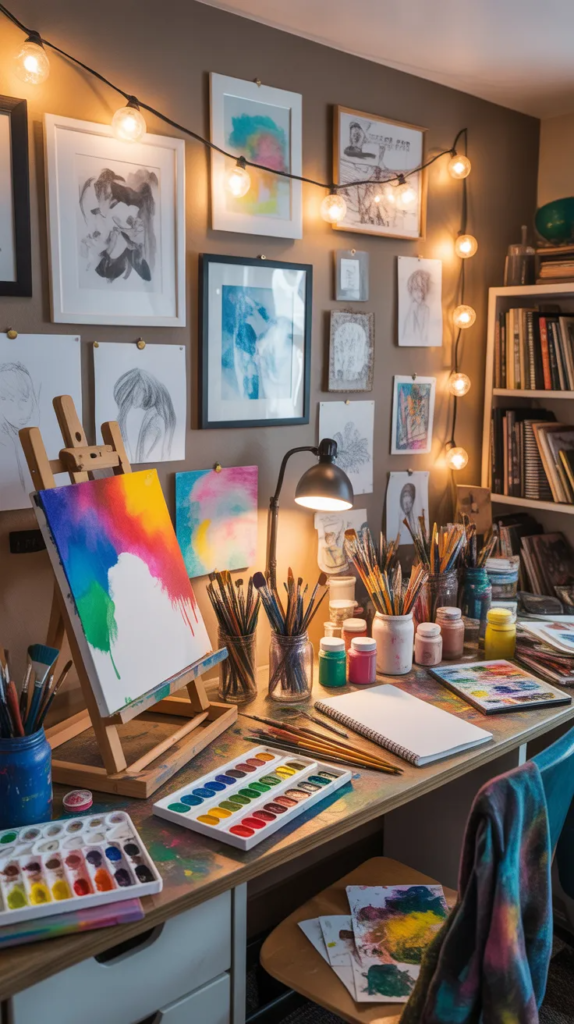 An artistic setup allows you to express yourself freely through colors, textures, and creative tools. Whether it’s painting supplies, sketchbooks, or mood boards, this type of dorm space feels alive and constantly evolving.