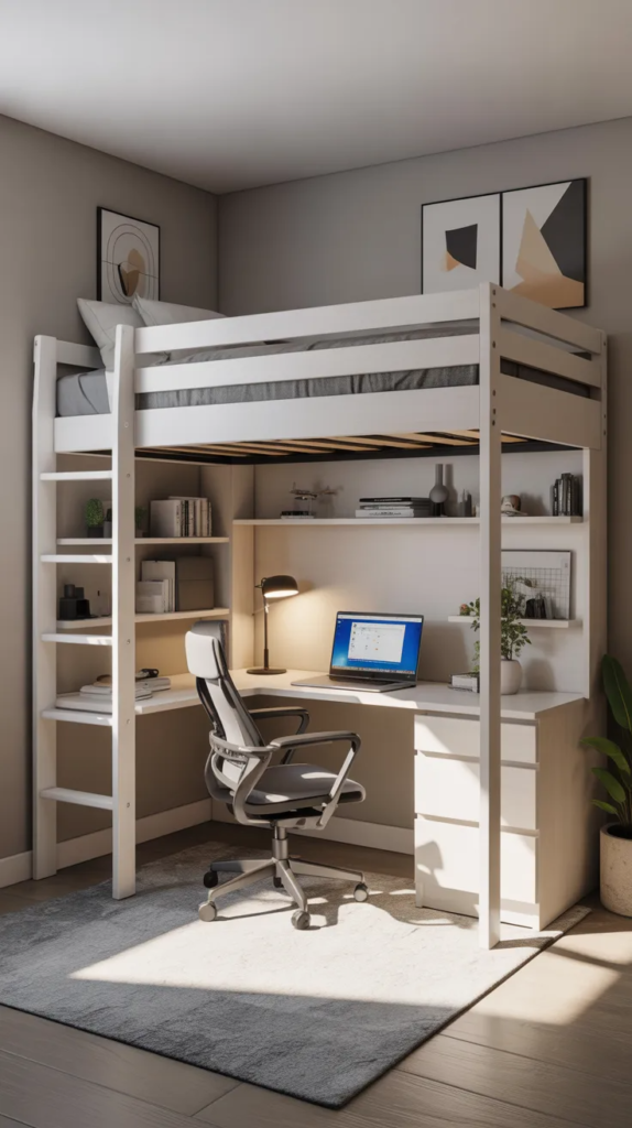 A loft bed setup helps you make the most of limited dorm space by creating two functional areas in one—sleeping above and studying below. This smart design allows for better organization and a more open floor plan.