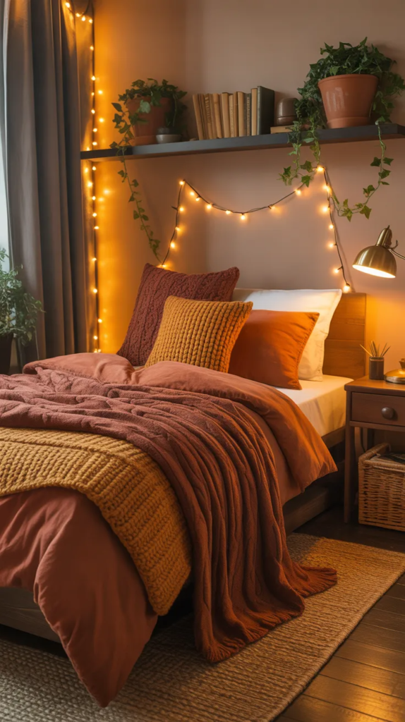 Autumn-inspired colors like rust, mustard yellow, and deep brown bring warmth and comfort into your dorm room. Combined with soft lighting and cozy fabrics, the space feels inviting and emotionally comforting.