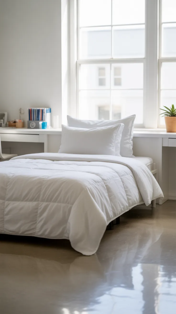 Image Prompt: Bright dorm with white walls, light wood furniture, soft gray bedding, minimal decor, natural sunlight.
