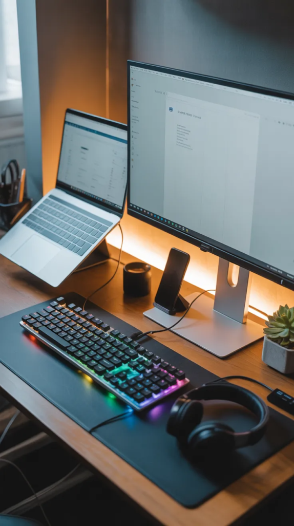 A tech-focused dorm setup includes modern gadgets like monitors, smart lighting, and ergonomic accessories that improve productivity and comfort during study sessions. Clean cable management keeps everything looking neat and organized.