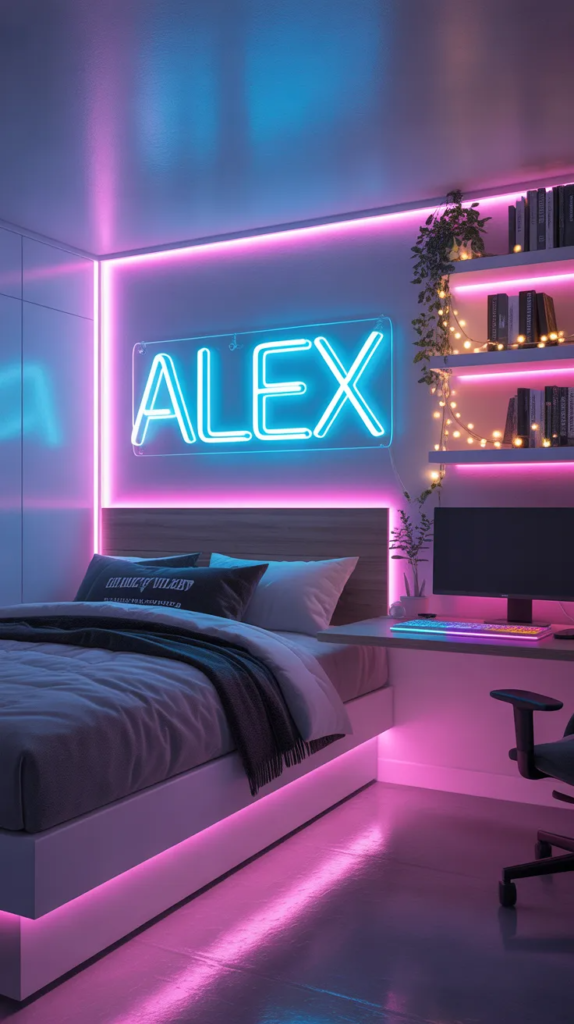 A personalized neon sign adds a unique and modern touch to your dorm room, instantly making it stand out. Whether it’s your name or a favorite word, it becomes a statement piece.