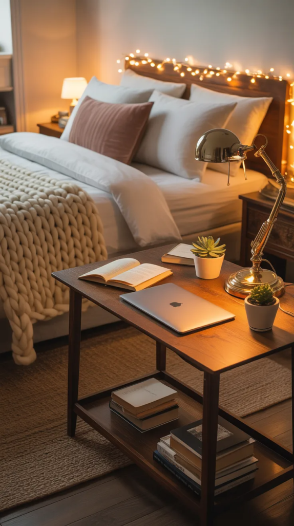 This idea is trending because it maximizes space while maintaining a cozy and relaxed environment. Adding soft blankets, pillows, and warm lighting helps blend the study area with the comfort of your bed. The room feels connected, functional, and inviting. It becomes a space where productivity and comfort exist together perfectly.