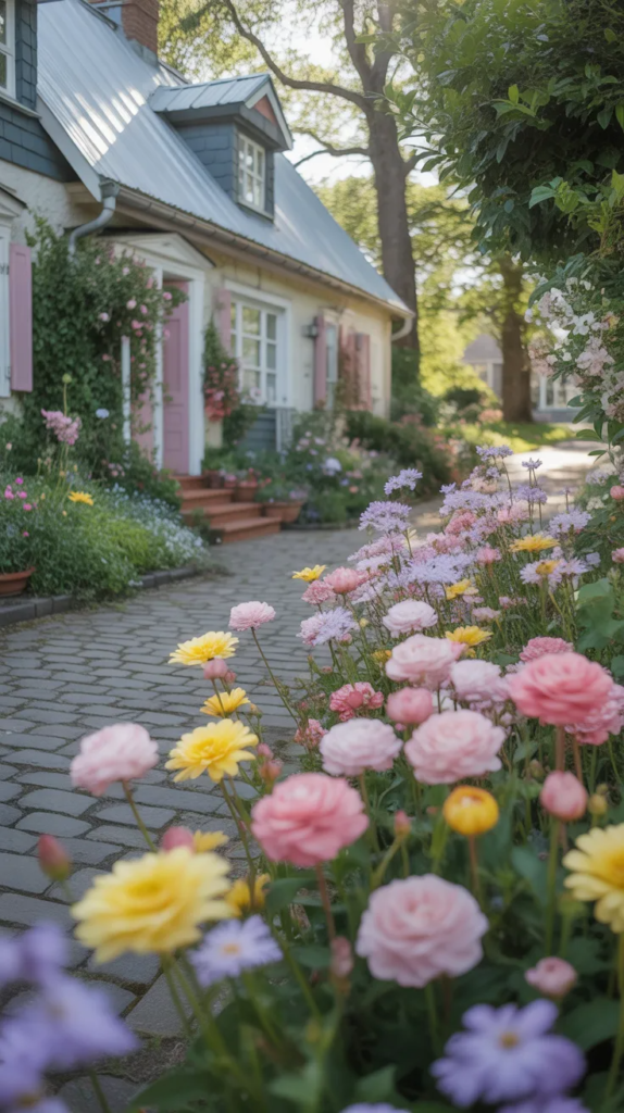 This idea is trending because it feels both classic and highly customizable. Whether you prefer soft pastels or bold colors, flowers can reflect your unique style. The result is a driveway that feels like a beautiful garden path, full of color and happiness.