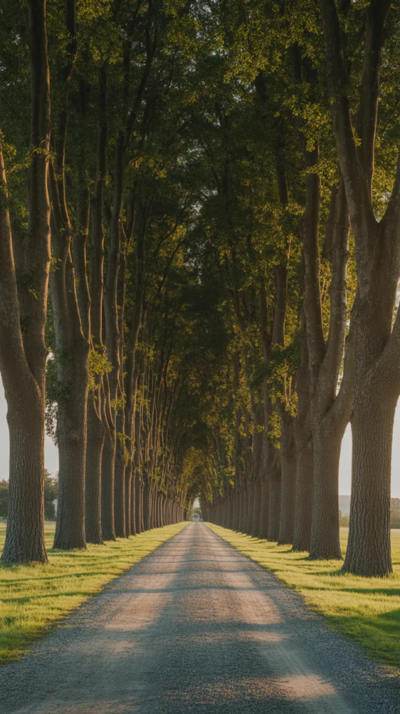 Tree-lined driveways create a sense of grandeur that instantly elevates your home’s curb appeal. Tall trees on either side form a natural canopy, adding depth and a feeling of privacy.