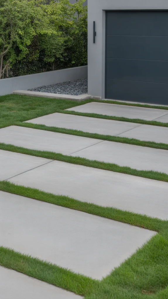 A grass strip driveway combines sleek design with natural elements, creating a perfect balance between modern and organic. Concrete or stone slabs are spaced with grass growing in between, giving the driveway a soft, breathable look.
