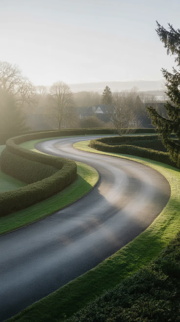 A curved driveway instantly adds elegance and movement to your front yard. Instead of a straight, rigid path, the gentle curve creates a sense of flow that feels more natural and inviting.
