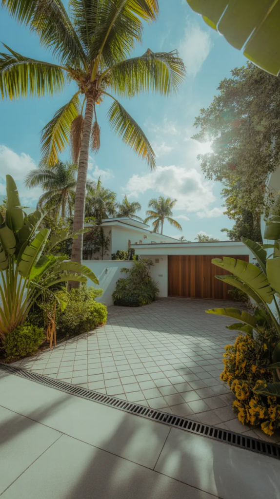 A tropical-inspired driveway brings a sense of relaxation and escape right to your home. Lush plants like palms and ferns create a vibrant and lively atmosphere.