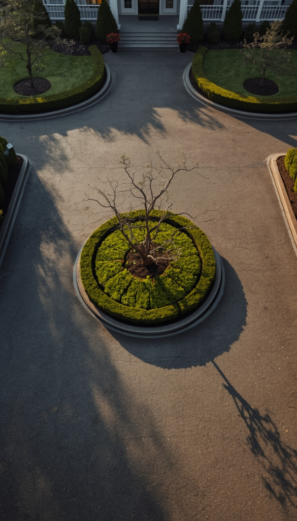 A double driveway with a center garden instantly adds a high-end, estate-like feel to your home. The central island becomes a focal point, allowing you to showcase plants, trees, or even decorative elements.