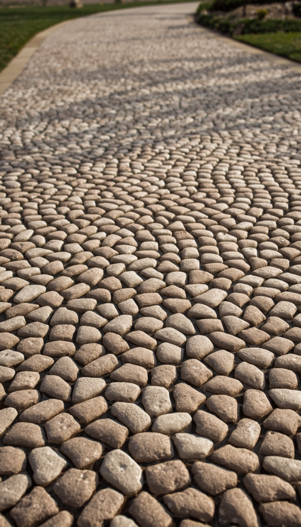 A pebble mosaic driveway turns a simple surface into a piece of art. Small stones are arranged in patterns, creating texture and visual interest that feels unique and handcrafted.