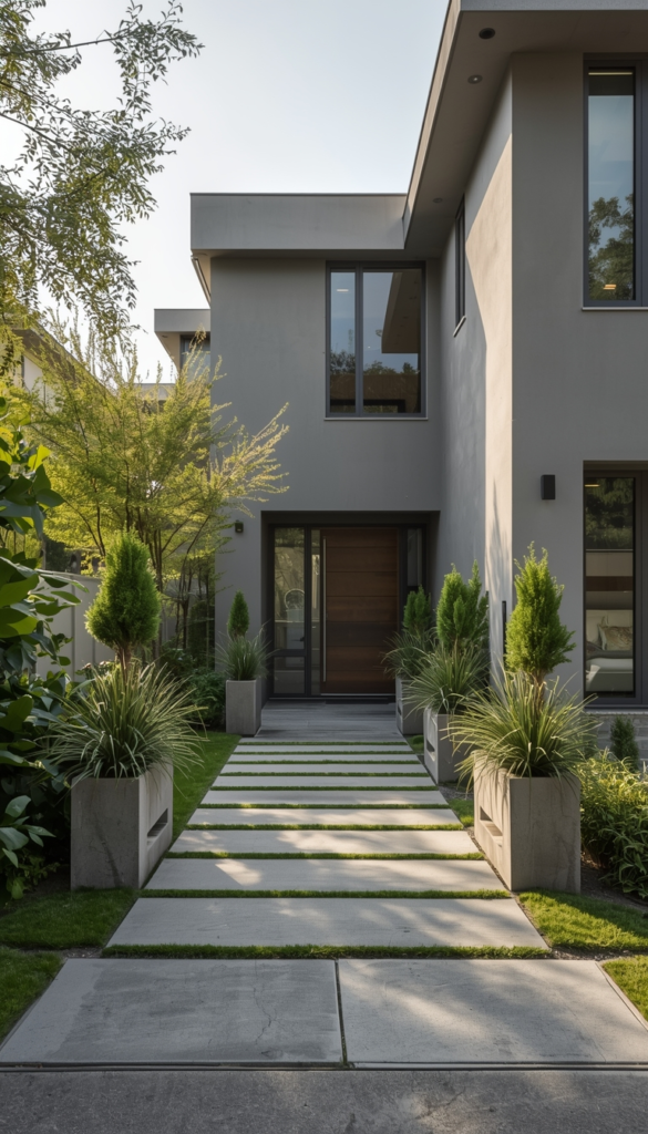 This trend is loved for its eco-friendly feel and visual appeal. It reduces heat while adding greenery without overwhelming the space. The contrast between hard surfaces and fresh grass creates a calming, stylish entrance that feels both contemporary and connected to nature.
