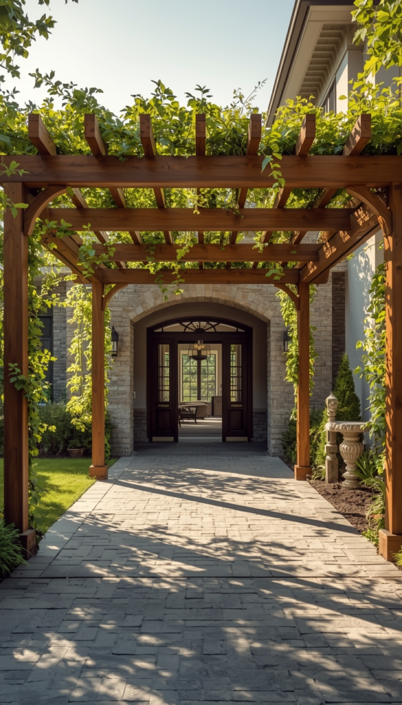 A pergola at your driveway entrance adds architectural interest and a sense of arrival. It frames the space while providing light shade and structure.
