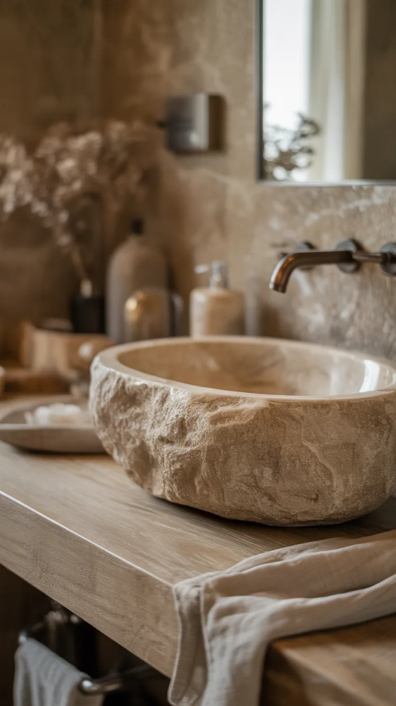 A stone sink instantly elevates an earthy bathroom with its raw, organic texture. Whether it’s marble, granite, or a rough-cut basin, the natural imperfections add beauty and uniqueness. These sinks create a strong visual focus while still feeling calming and grounded, blending effortlessly with wood and neutral tones.