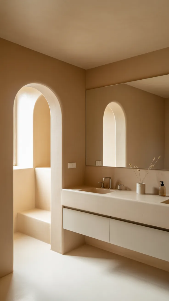 Soft beige tones create a peaceful and uncluttered bathroom that feels instantly relaxing. This minimalist approach focuses on simplicity, using neutral colors and clean lines to create a breathable and open environment. The absence of clutter allows the mind to relax, making the bathroom feel like a true escape.