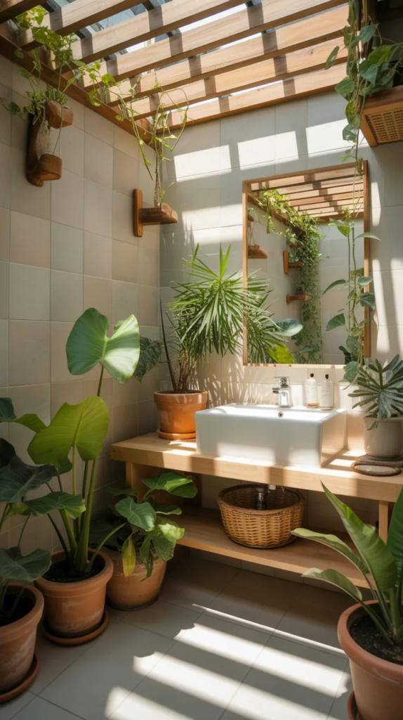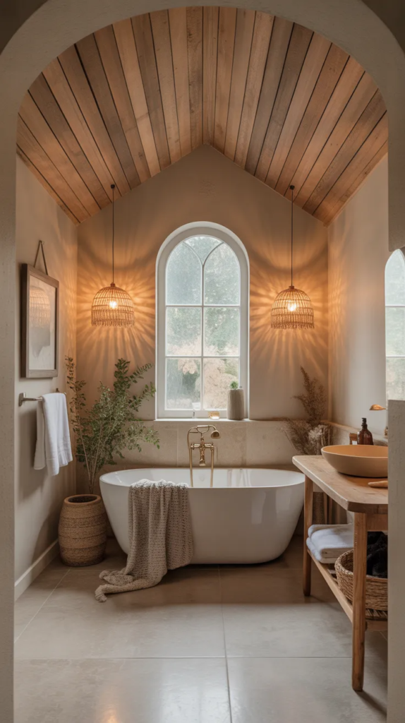 This idea is trending because it breaks away from traditional flat white ceilings. The natural wood tones create a continuous earthy flow, making the bathroom feel cohesive and inviting. It’s a subtle yet powerful way to elevate the entire space.
