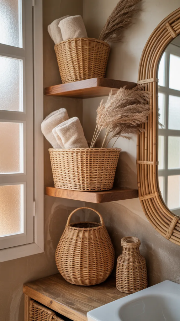 Woven textures like rattan and wicker bring softness and depth into an earthy bathroom. These details add a handcrafted feel that makes the space more personal and inviting. They work beautifully with neutral tones and natural materials.