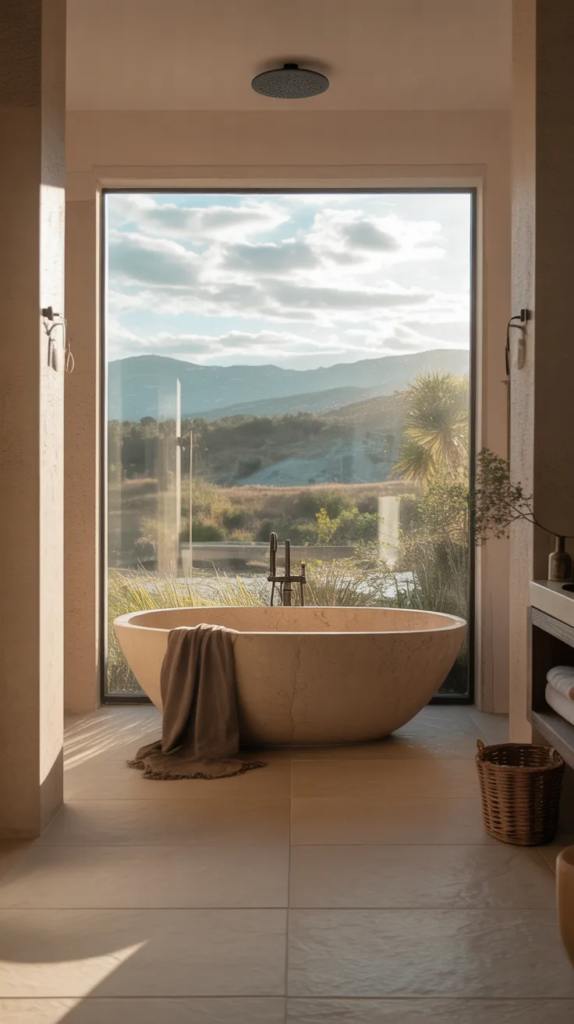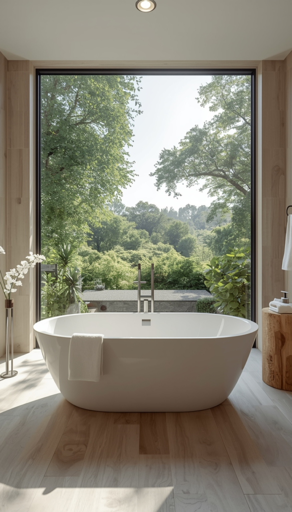 A large window with a view of nature transforms your bathroom into a serene escape. Whether it’s trees, plants, or sky, the outside view adds life and openness to the space. Natural light enhances every detail.