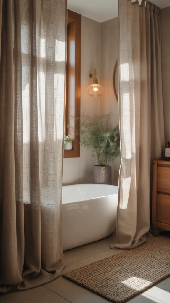 This idea is trending because it introduces movement and warmth without overwhelming the design. The slightly wrinkled texture of linen adds a relaxed, lived-in charm that feels authentic. It’s a simple touch, but it makes the bathroom feel more like a serene, personal sanctuary.