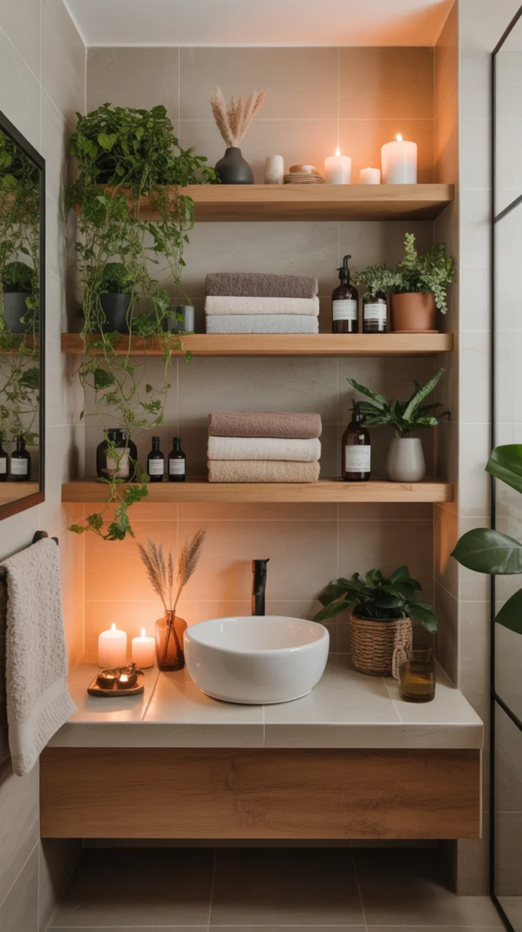 Floating wooden shelves are the perfect mix of practicality and style. They provide storage while also showcasing beautiful decor like folded towels, candles, and small plants. The natural wood tones add warmth and break up plain walls, making the space feel more dynamic and inviting.