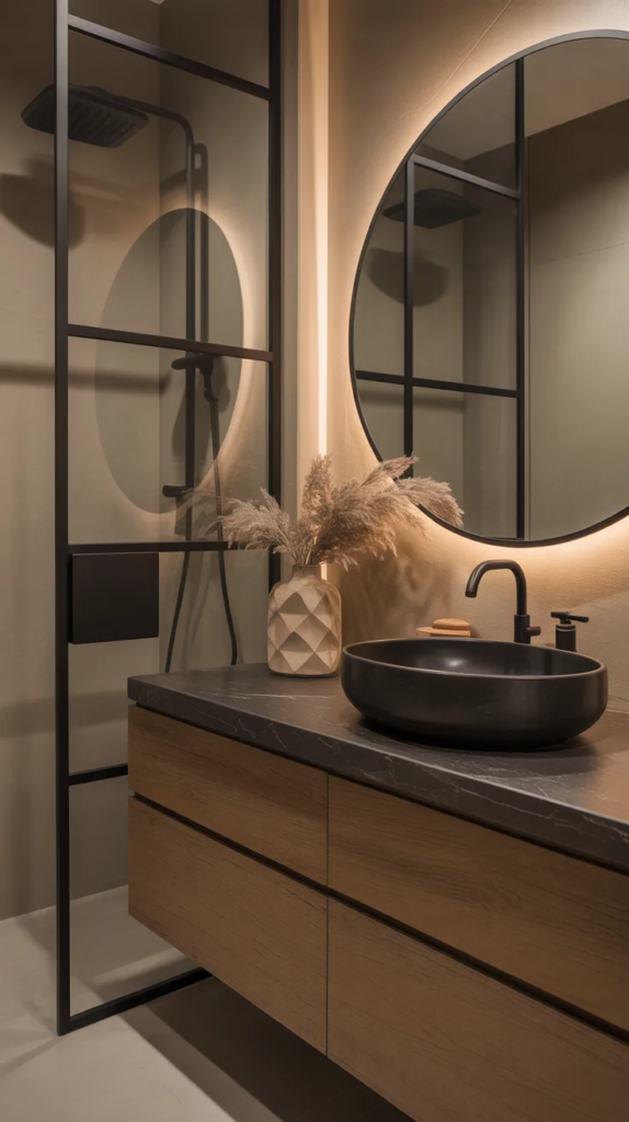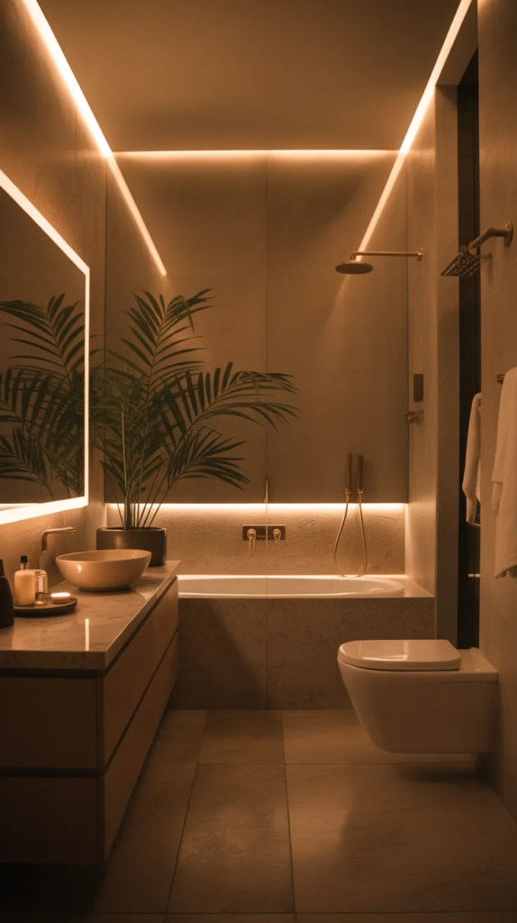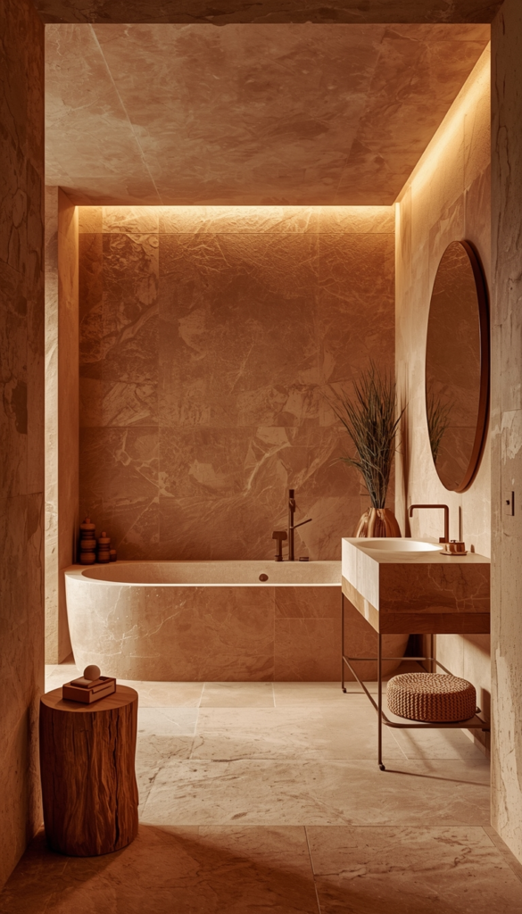 Lighting plays a huge role in creating an earthy bathroom, and soft ambient lighting can completely change the mood. Warm, diffused light creates a gentle glow that feels calming and inviting, especially in the evening. It turns the bathroom into a peaceful retreat rather than just a functional space.