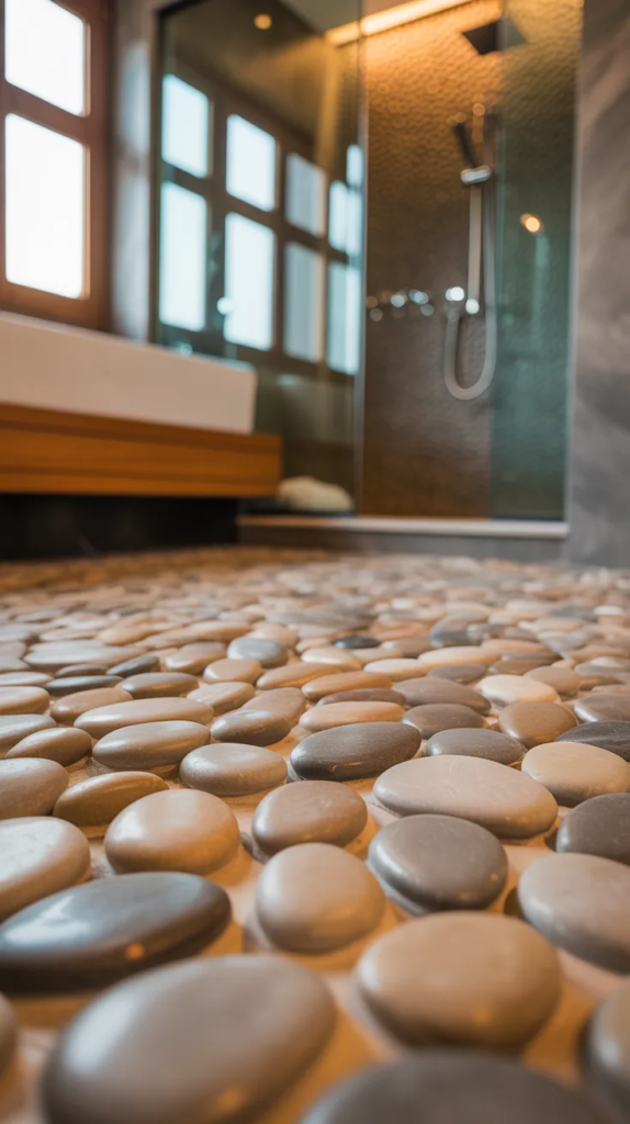 A pebble floor brings the feeling of nature directly into your bathroom. Walking on smooth stones creates a gentle massage effect, making every step feel relaxing and grounding. The organic shapes and textures add visual interest while keeping the space calm and natural.